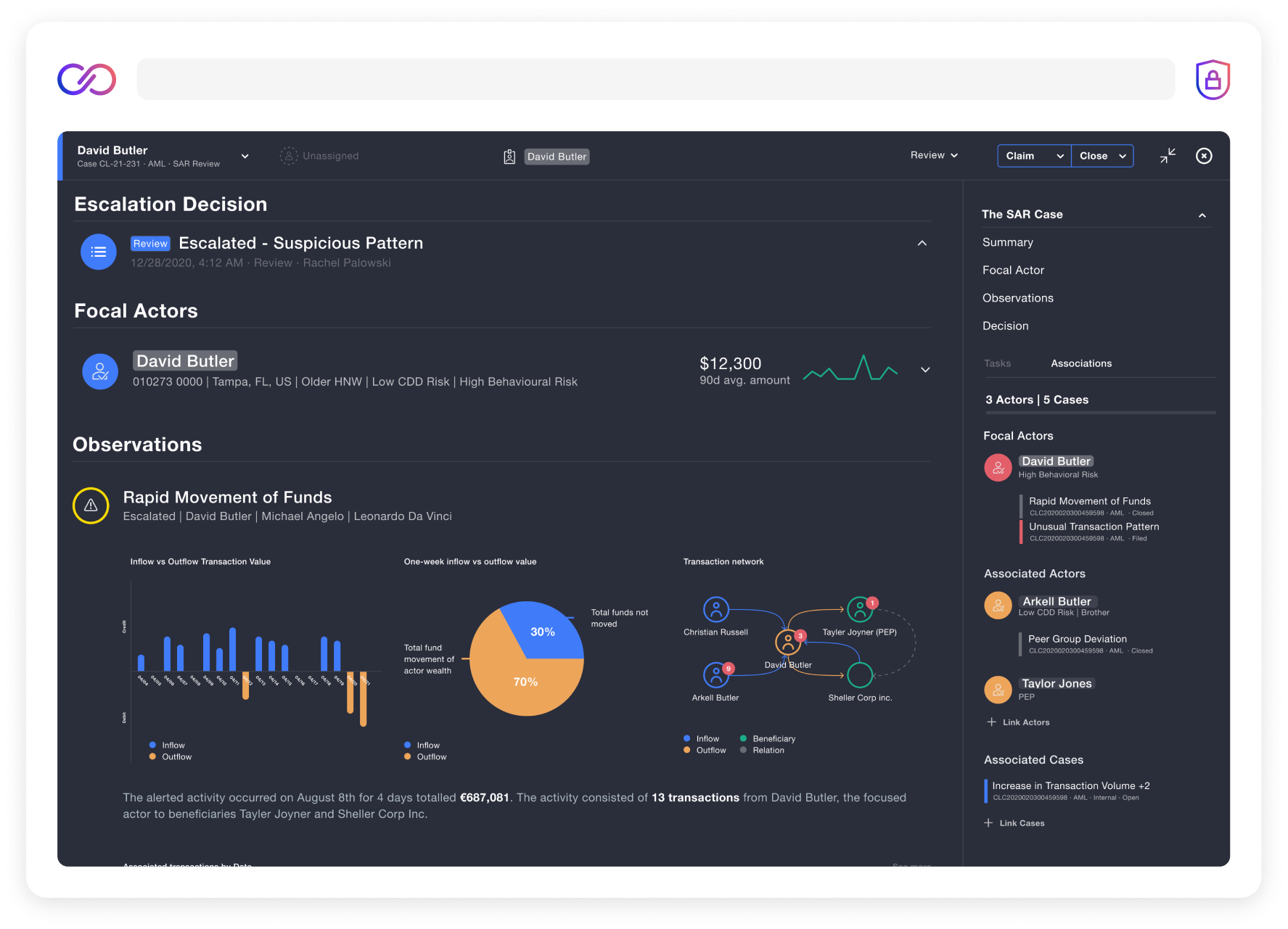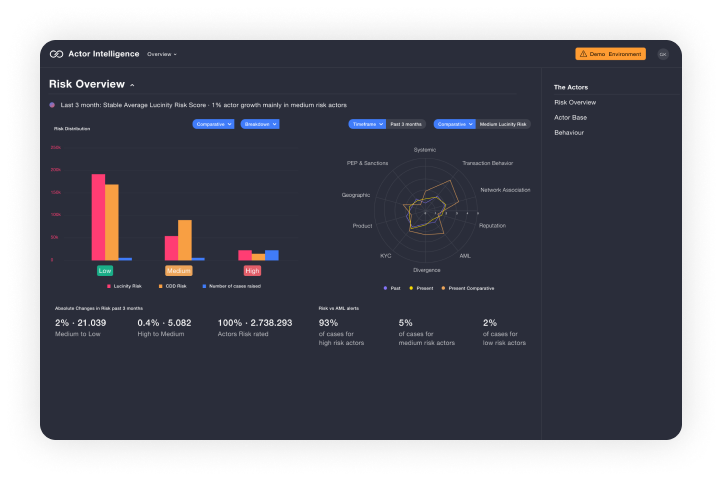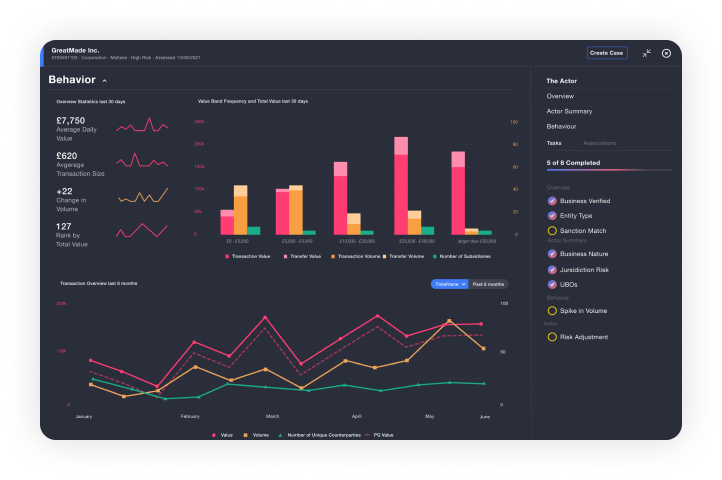 At Lucinity, we put the AML professional user first when we design our user interface. For example, when a user has clicked on a case, we tell a visual story about why the behavior is considered suspicious. Patterns and trends are clearly shown and easy to understand. Great UX is vital for busy AML compliance teams; it means more productivity and improved job satisfaction for the essential professionals that use it.