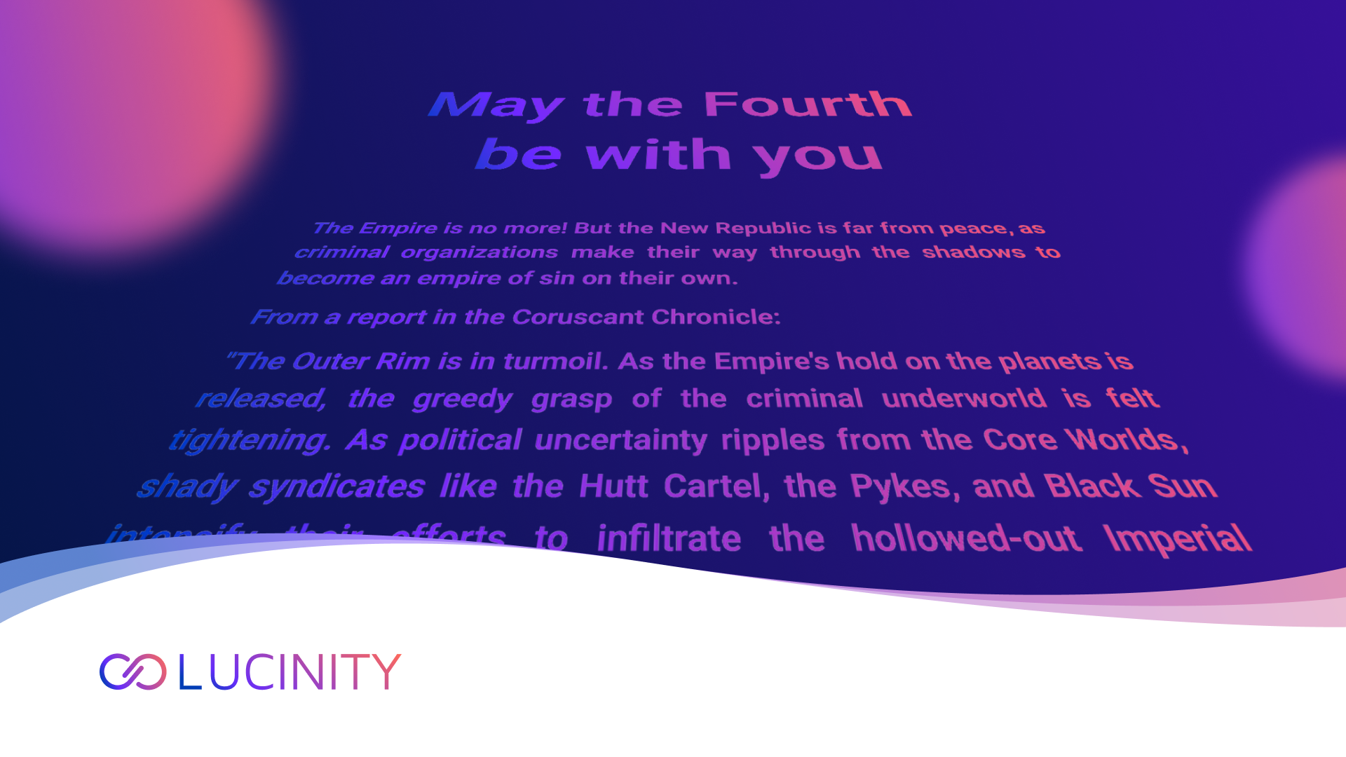 With shady dealings ongoing, the investigators of dirty credits have their work cut out for them, but armed with Lucinity their results speak for themselves. The New Republic may be still finding its footing to bring order to a galaxy long-suffering, but Lucinity is ready to shine a light into the darkness."